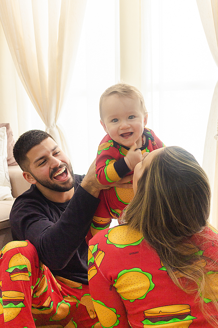 Para completar nosso ensaio a família entrou no clima do ensaio e vestiram pijamas todos com a mesma estampa de hambúrguer, trazendo um clima descontraído para o nosso lifestyle.