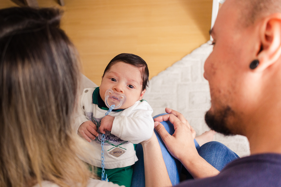 Bebe olhando para câmera na hora da foto. Ensaio lifestyle newborn e de família em casa.